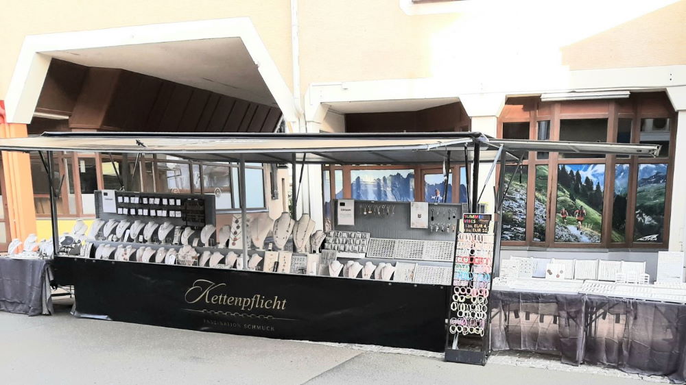 Wir verkaufen unseren Schmuck auf verschiedenen Märkten und Messen. Unsere Verkaufsanhänger und Messestände sind leicht zu erkennen. Bei uns funkelt und glitzert es!